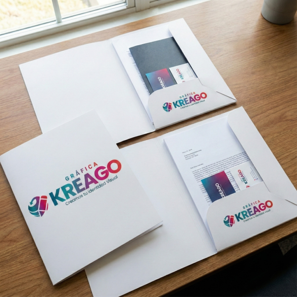 Para KreaGO, una carpeta corporativa es el sistema de presentación que unifica y eleva la percepción de tu empresa. Creamos carpetas que no solo almacenan documentos, sino que estructuran tu comunicación en reuniones, pitches comerciales y eventos.
